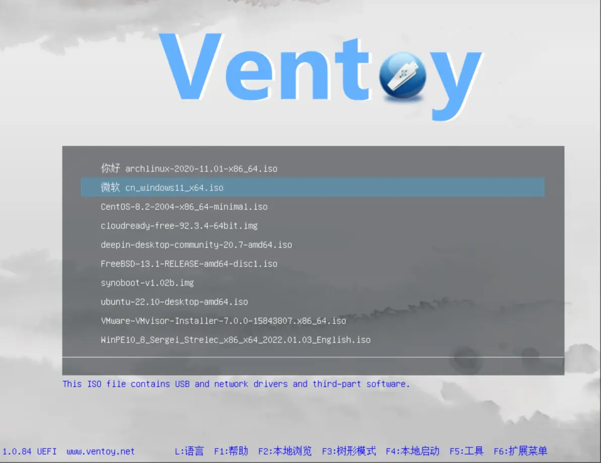 你可以一次性拷贝很多个不同类型的镜像文件,Ventoy 会在启动时显示一个菜单来供你进行选择 (参见 截图)。