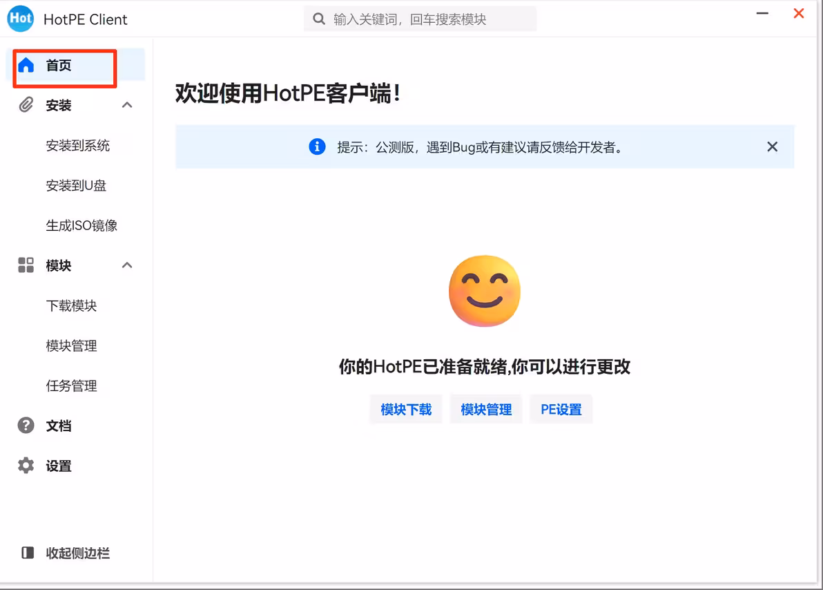 2、下载结束后依照国际惯例先解压,双击exe运行主程序,插入U盘,我们点击左侧菜单栏的安装到U盘后会自动识别到U盘,当我们点击开始安装会报错提示当前没有下载模块还是什么提示,请到首页进行下载,我们点击首页,下载就行,下载结束后再回到安装到U盘点击开始安装就成功安装了